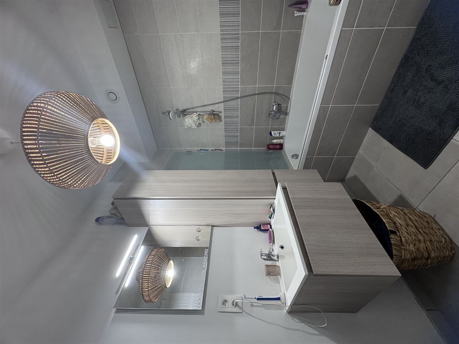 L’appartement se compose comme suit : un séjour lumineux avec cuisine ouverte, deux chambres, une salle de bain et un WC séparé. L’espace de vie donne directement accès à la terrasse, idéale pour se détendre ou recevoir. Une pièce supplémentaire à l’arrière de la cuisine peut être utilisée pour le rangement ou comme buanderie.
