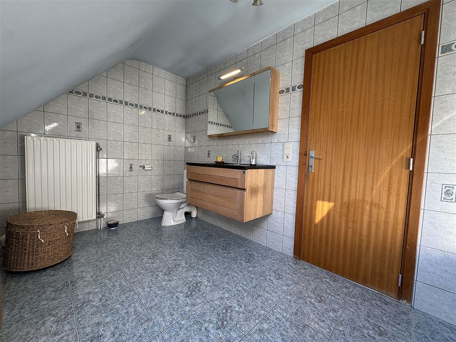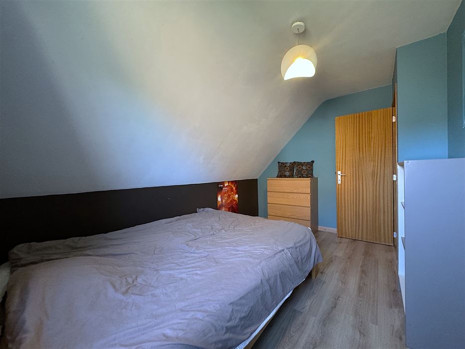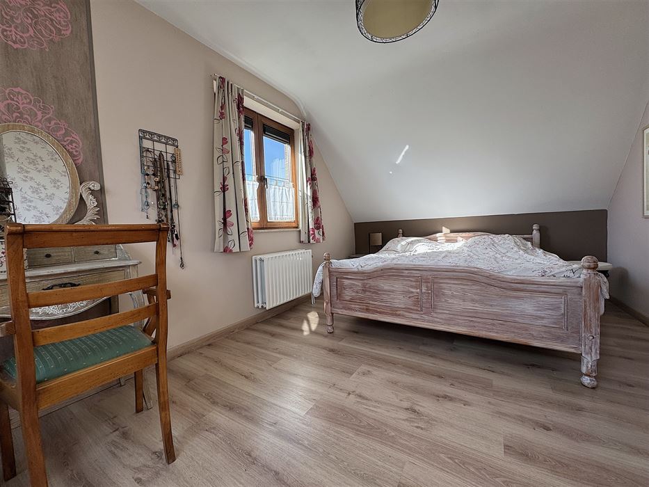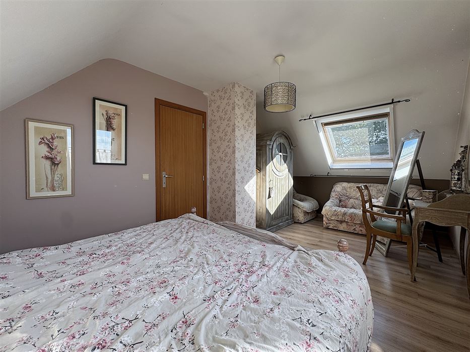 Au 1er étage nous avons un hall de nuit donnant accès aux 3 chambres (légèrement mansardées), à un petit coin grenier et une salle de bains ( baignoire/douche, WC et meuble évier).