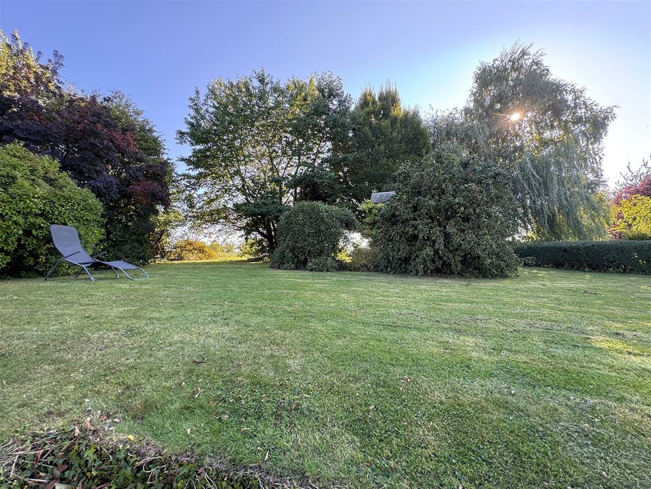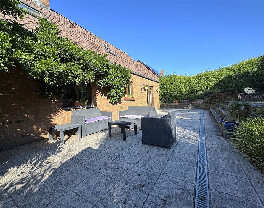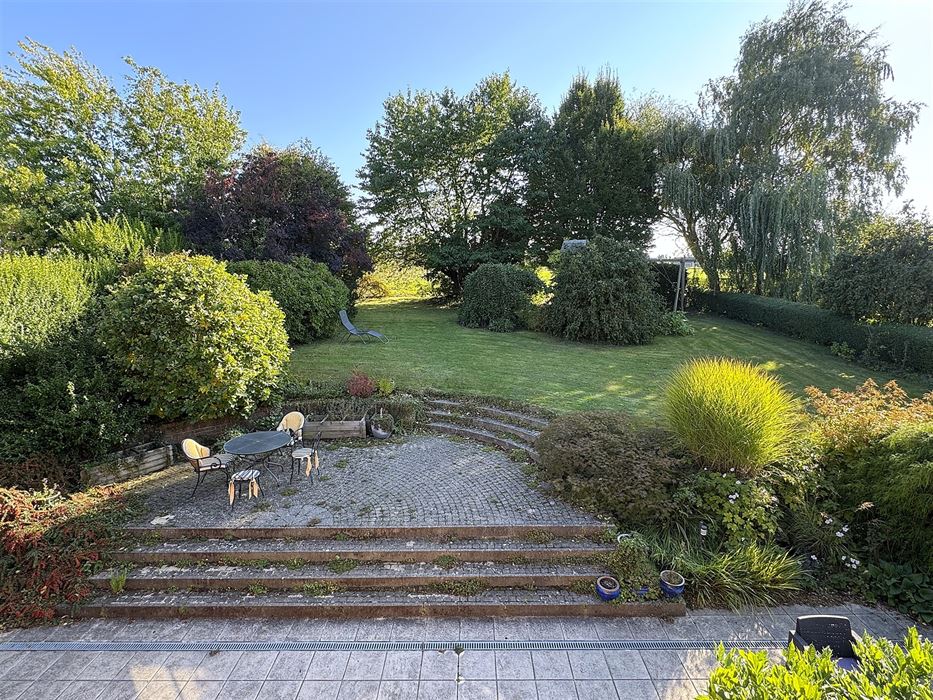 Extérieur : spacieuse terrasse en Klinkers donnant accès, via quelques marches, au jardin. Ce coin de verdure est un vrai petit paradis.