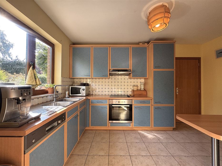 Le living de plus de 30m² offre un confort de vie avec sa vue sur la terrasse. La cuisine est entièrement équipée et fonctionnelle. Les châssis de part et d’autres de la maison donne une lumière traversante pour apporté une belle luminosité au bien.