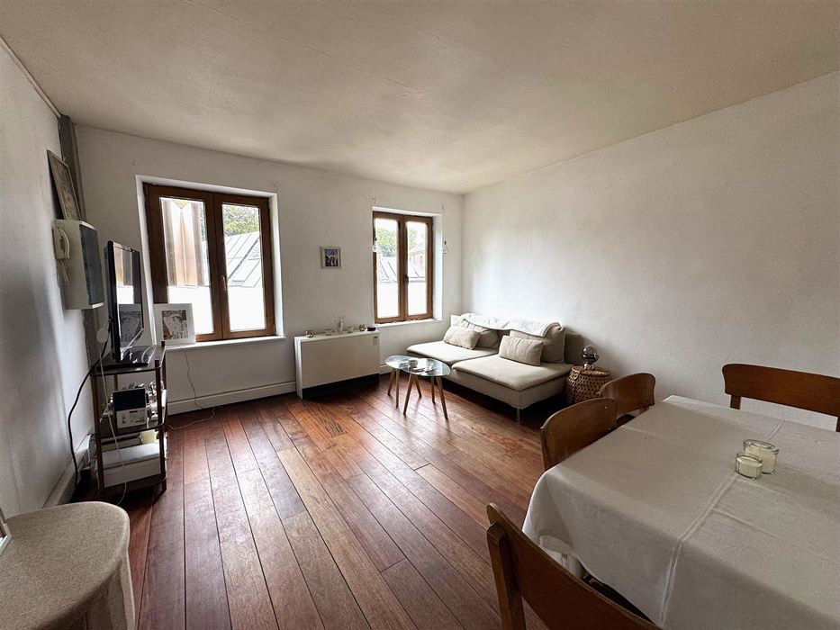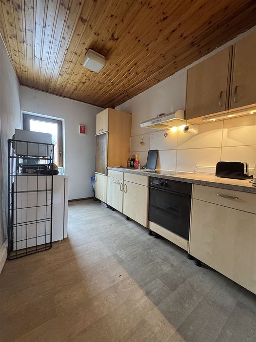 Un séjour/salle à manger avec plancher en bois, une cuisine semi-équipée, une chambre de ±13,75m², une salle de douche avec WC.