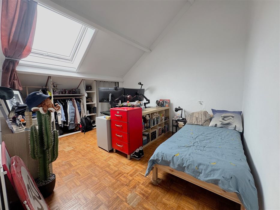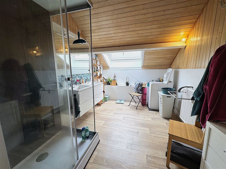 A l’étage nous avons un hall de nuit avec accès a une salle de bain avec coin buanderie et 2 chambres spacieuses (17 et 13m²)