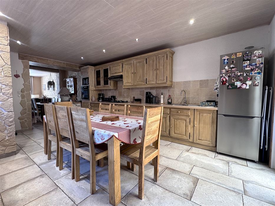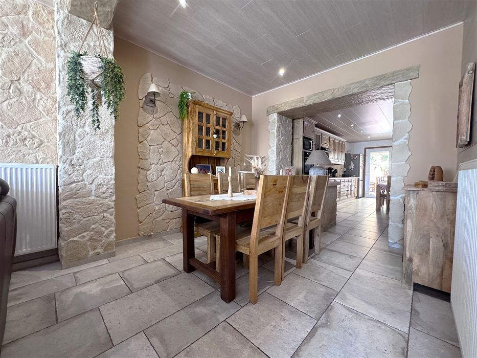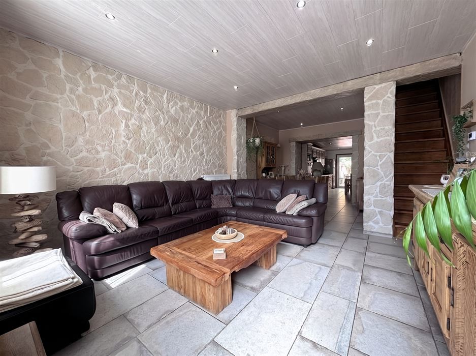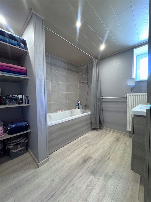 Au rez-de-chaussée, nous avons un grand living de +- 30m² ouvert sur la cuisine de +-21m². WC séparé. Local chaufferie donnant accès à la cave où se trouve la buanderie et une cave de stockage. L’accès à la cour se fait par la cuisine.