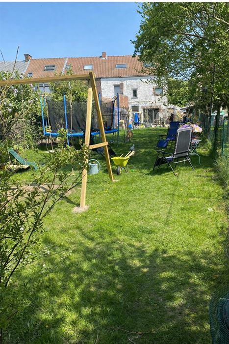 Extérieur : terrasse et jardin. Via l’avant de la maison nous avons accès a un petit garage.