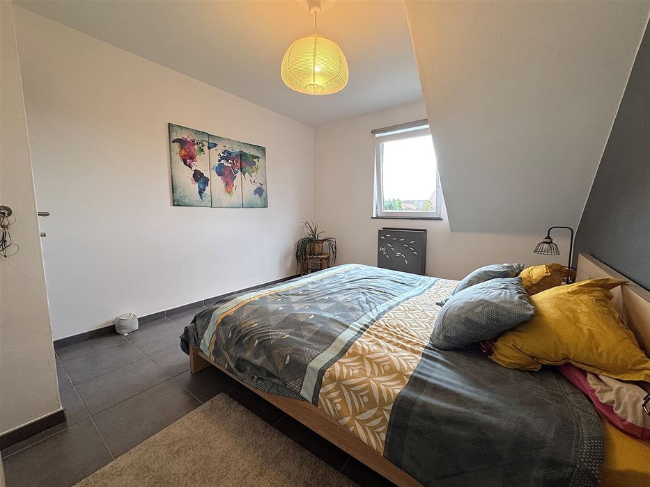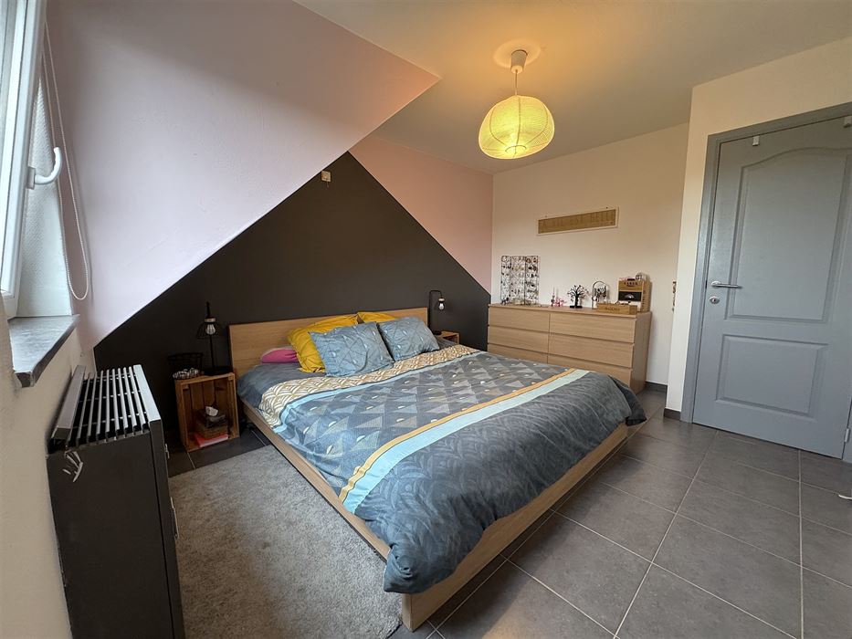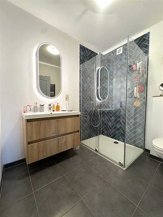 Un hall d’entrée desservant d’une part, une cuisine équipée neuve ouverte avec un bel espace pouvant servir de salle a manger et/ou salon, un accès une terrasse de +-6.5 m². D’autre part, un WC séparé, une buanderie, une salle de douche complètement neuve avec un WC suspendu et meuble lavabo, 2 chambres de 10 et 13m².
