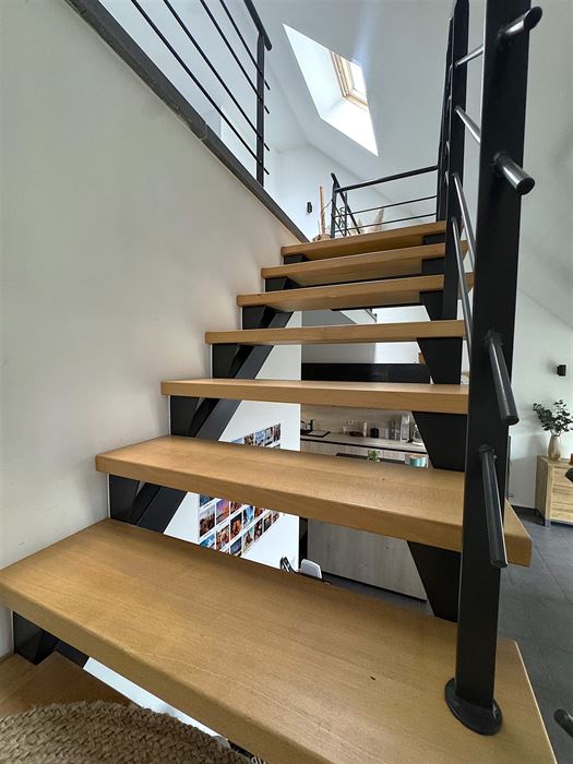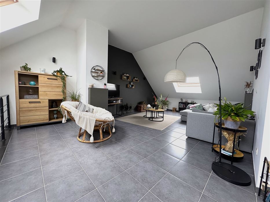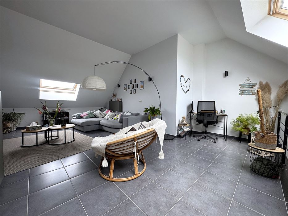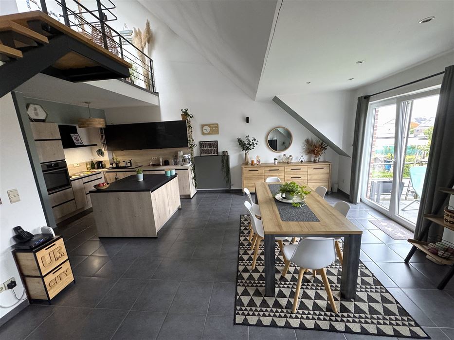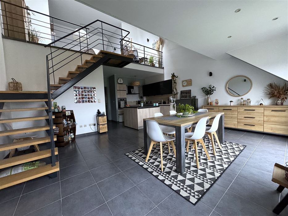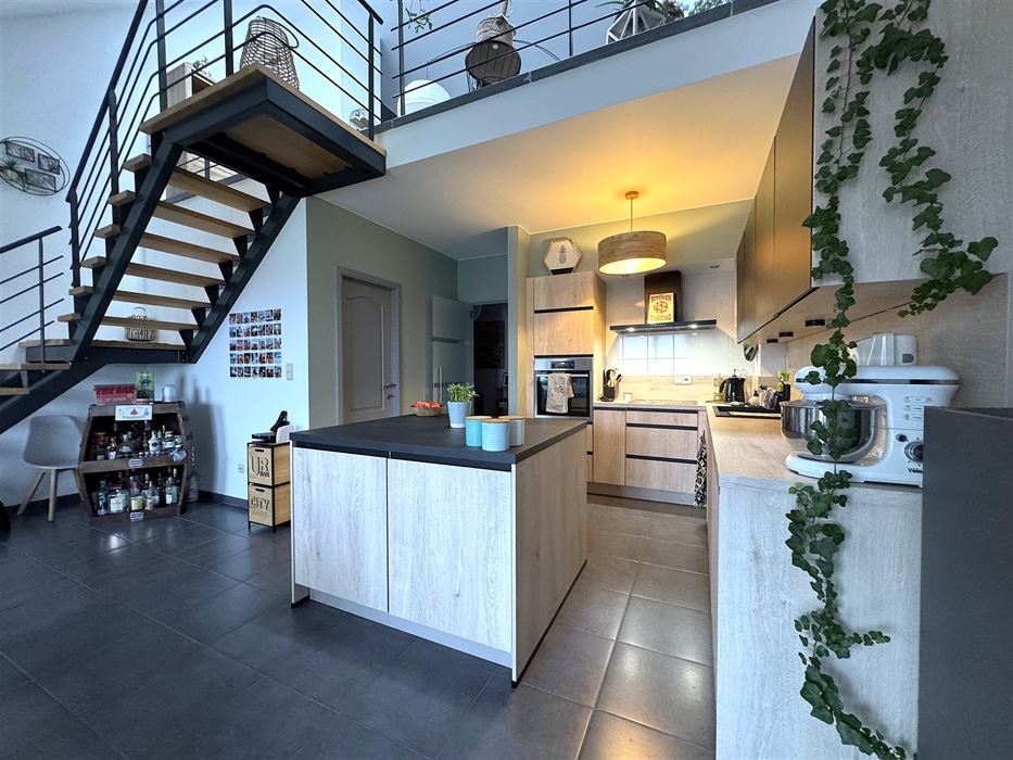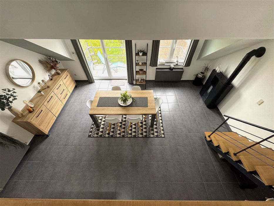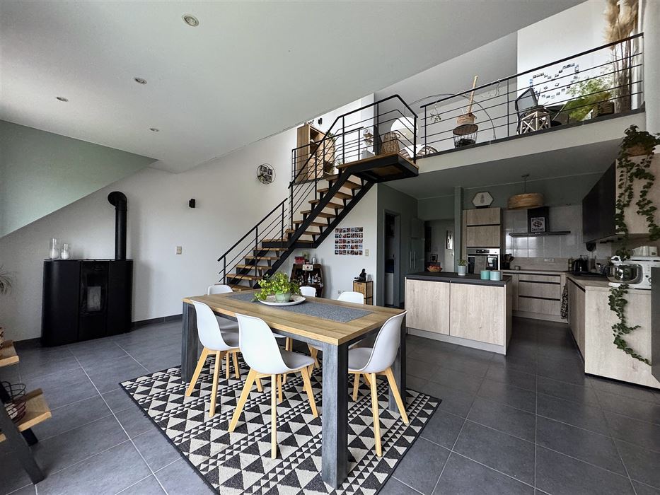 A l’étage on retrouve une pièce magnifique de +- 35m² en mezzanine servant de séjour et coin bureau.